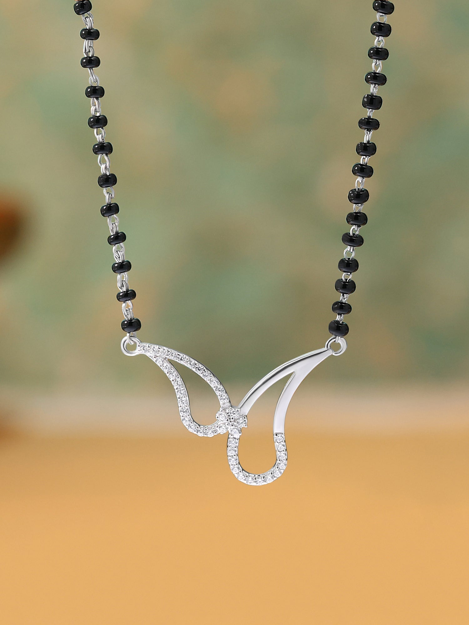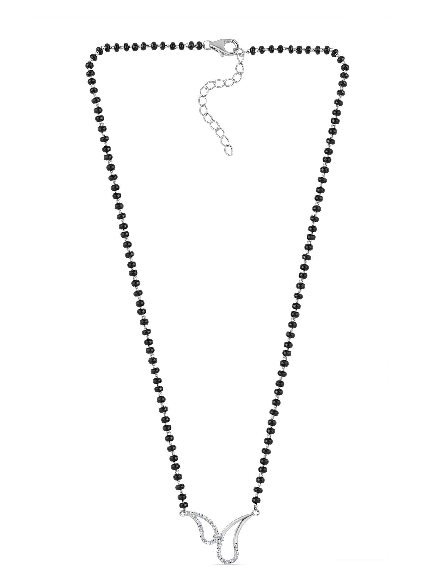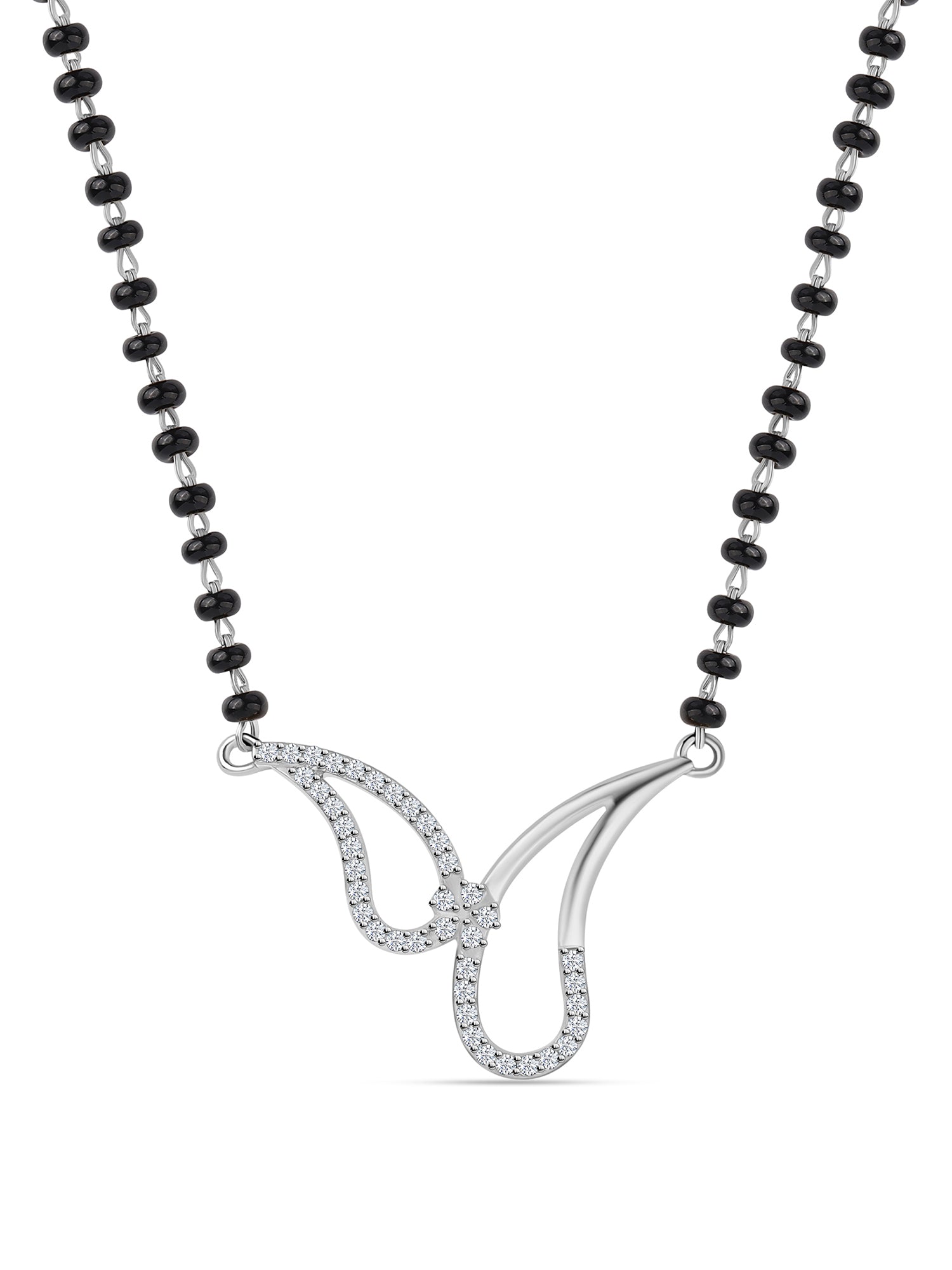A trendy yet traditional design silver mangal sutra with a diamond look. Studded with CZ makes an excellent lightweight daily wear mangalsutra for women.