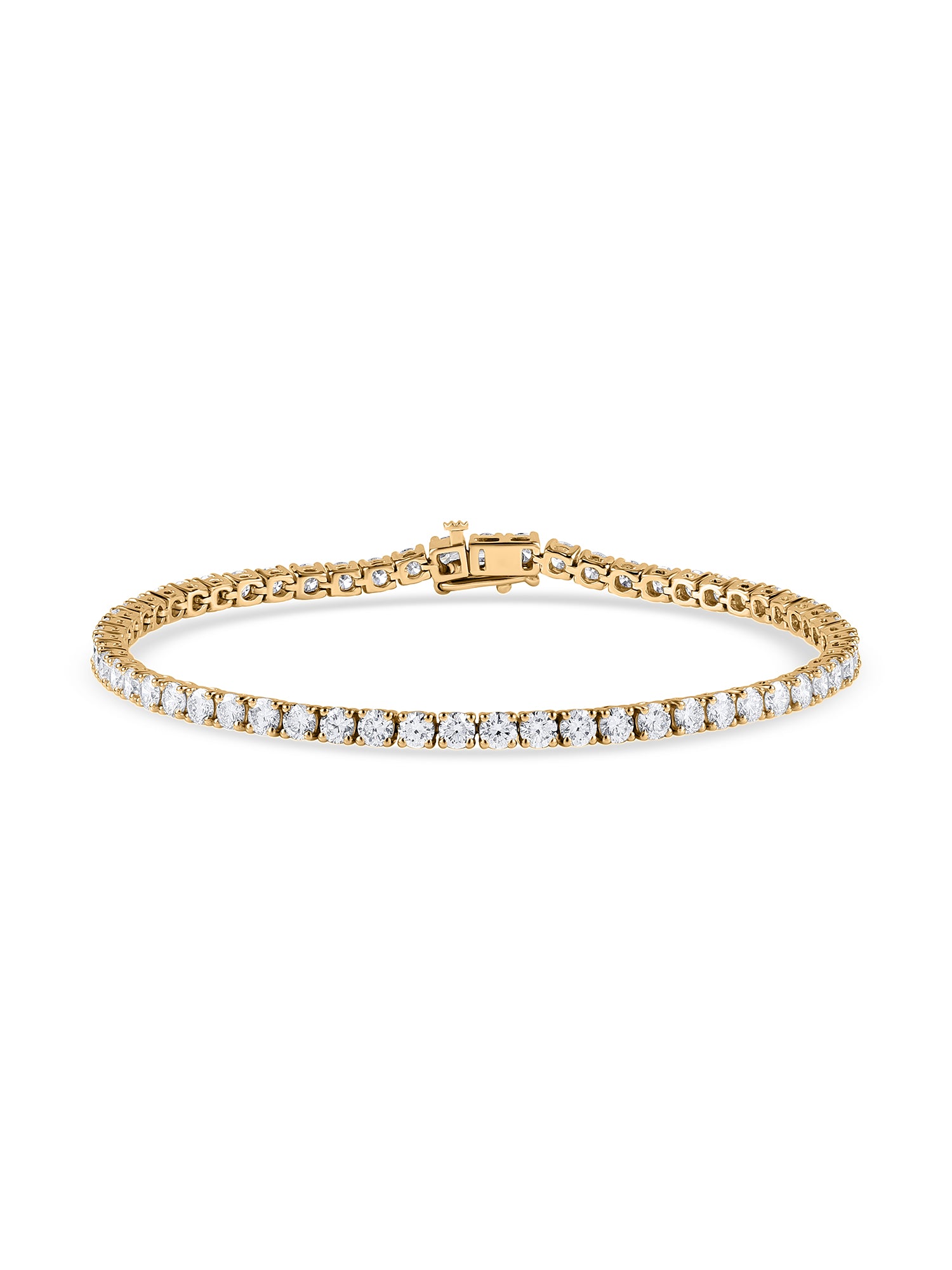 A lab grown tennis bracelet brings laboratory brilliance to a court-side classic. Each link holds a precision-cut diamond clone—atom for atom the same sparkle as a mined stone—set in recycled 14 k white or yellow gold. Because the gems are grown in small batches, color and clarity stay consistent along the line, so the eye sees an even ribbon of light rather than a mix of tones.
