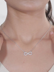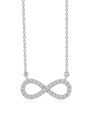 An infinity design pendant made with pure silver and then rhodium polished to a shine.