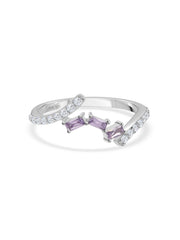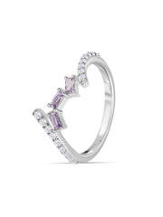 A rich hue of purple baguettes with a combo of white cz makes this silver ring for women a classy jewel that can be worn daily. made with silver and rhodium polished to a high shine this ring is a sure winner