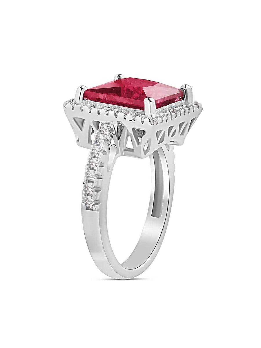 Red Ruby And American Diamond Princess Cut Party Wear Ring In 925 Sterling Silver