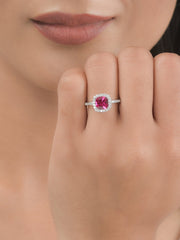 A gorgeous celebrity style ring in an AAA grade highest quality American diamond and created red ruby. This is a very popular and trendy design. One of our bestsellers. Suits every hand shape and shines so bright on your hand. The centre red stone looks so bright and is a favourite among Indian women. This makes a lovely gift for her as well. Want to propose with a big rock. Pick this ring for her and she will love the style it offers.